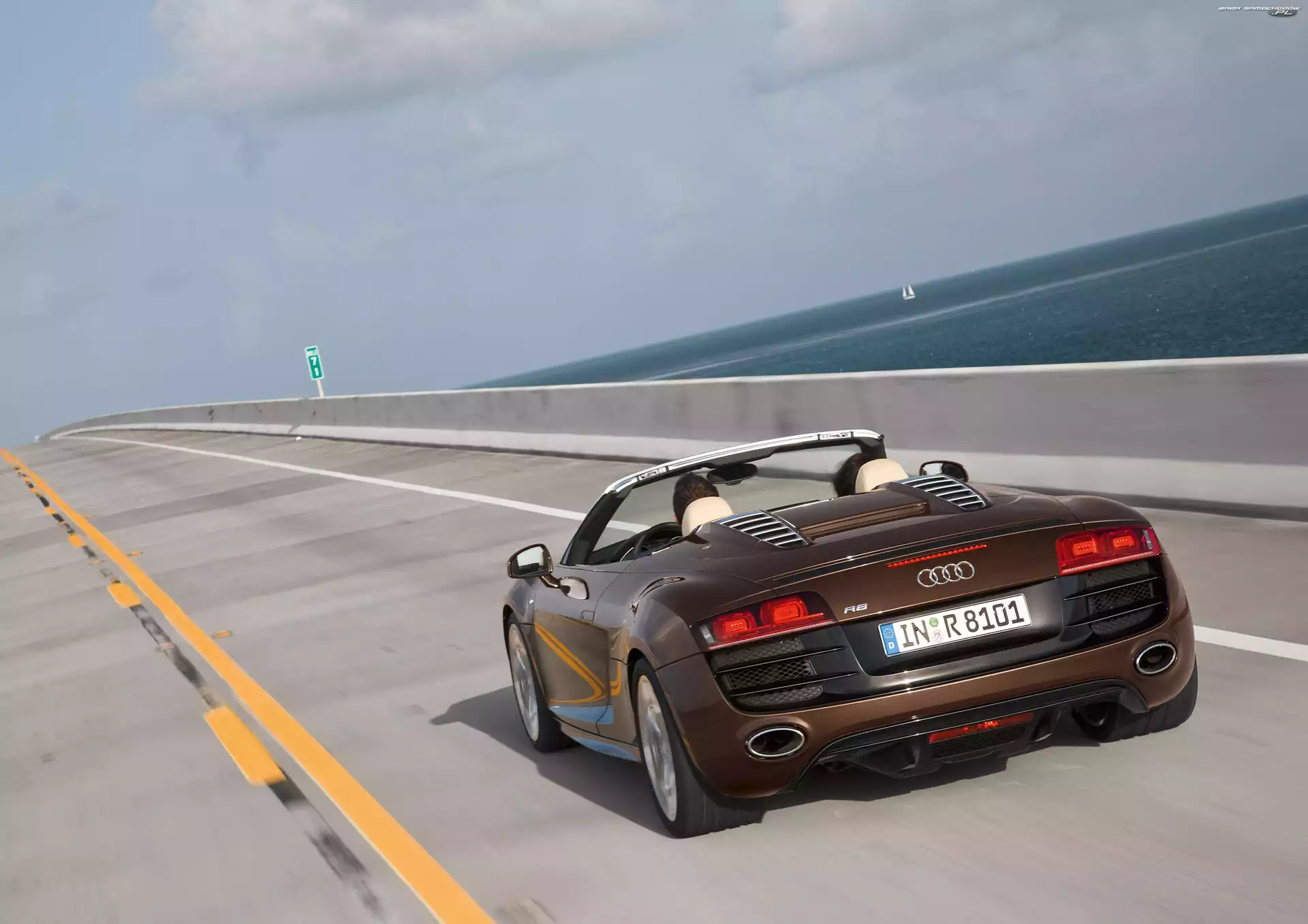 Audi R8, Fontanna Audi R8, Spyder Nowoczesność, Audi R8, Słońce Sport, Audi R8, Spojler Morze, Audi R8 Spyder Audi R8, Tuning Sport, Audi R8, LMS Dyfuzor, Audi R8 Wyścigowy, Audi R8, Tor Brązowe, Audi R8 Spyder Testowa, Audi R8, Jazda Audi R8, Lewy, Tył Karbonowe, Audi R8, Elementy Audi R8, Srebrne